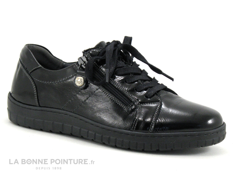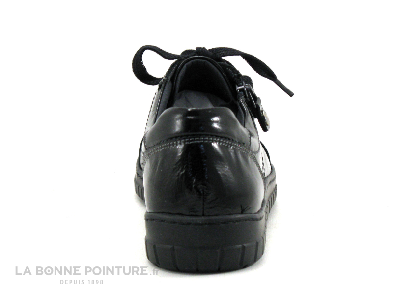 Ce derby Femme grande largeur Kiazip est en cuir noir verni, avec une fermeture éclair sur le côté.