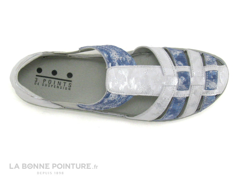 Cette chaussure aérée Femme est en cuir velouté gris et bleu métallisé.