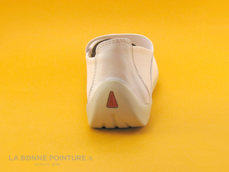 La pointe de la chaussure est arrondie, et le cuir blanc cassé a un aspect légèrement grainé.