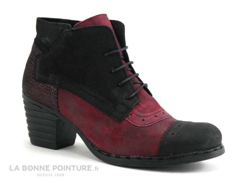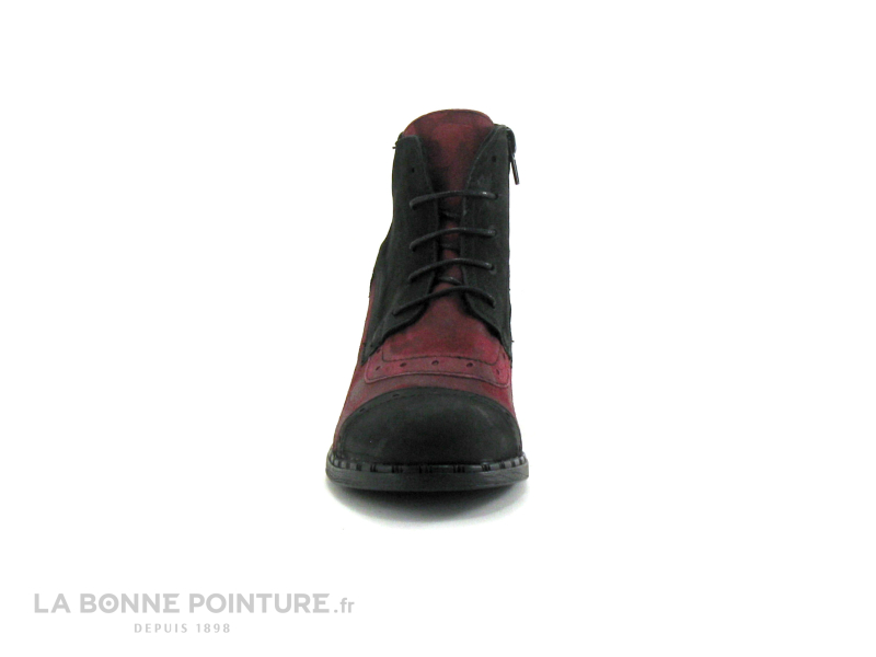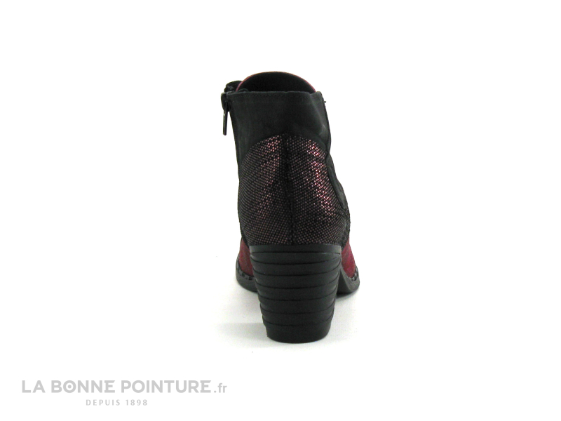 Ces boots à talon combinent un cuir noir mat et un cuir velouté bordeaux, avec le contrefort noir et rose métal.