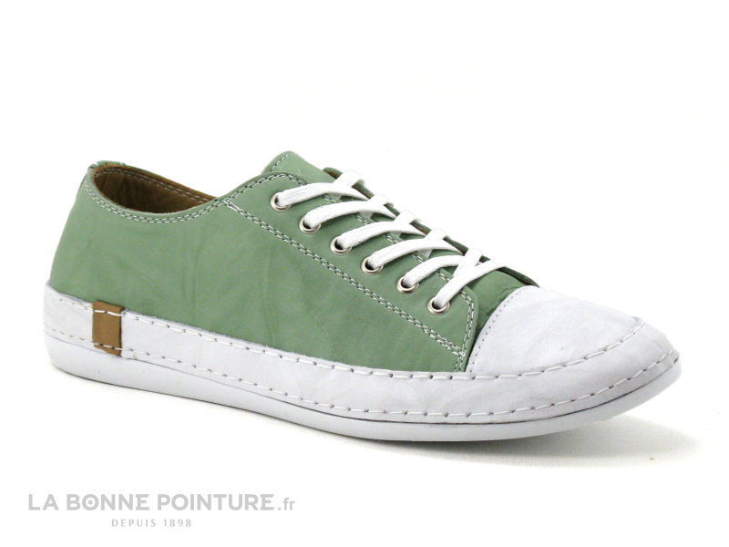 Cette basket basse Femme Andrea Conti est en cuir vert aspect froissé, avec la pointe et le pourtour en cuir blanc.