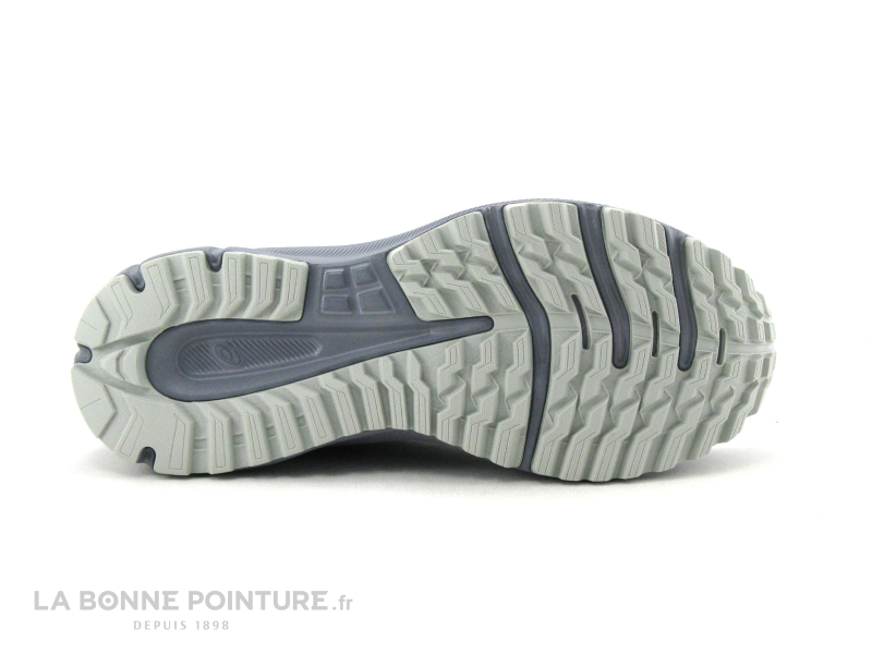 La semelle de marche grise de la chaussure de trail Femme Asics possède des crampons pour une bonne accroche, elle est légère avec un très bon amorti.