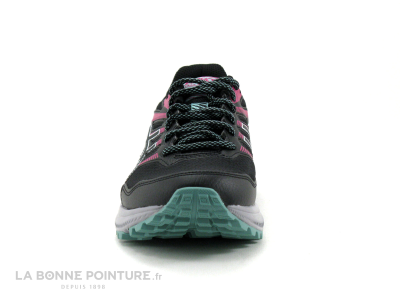 Cette chaussure de sport Femme avec crampons est en tissu et matières synthĂ©tiques aux tons de noir, de rose fuchsia et de vert d’eau.