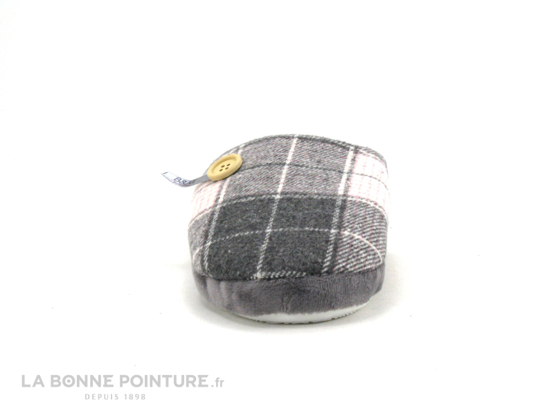 Cette pantoufle petit prix Femme est en textile molletonné gris et rose à carreaux.