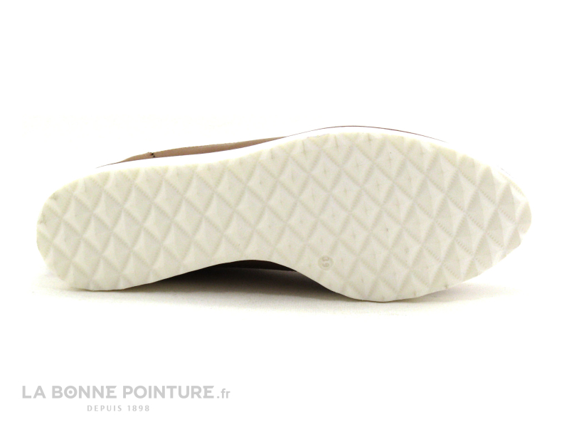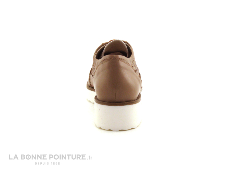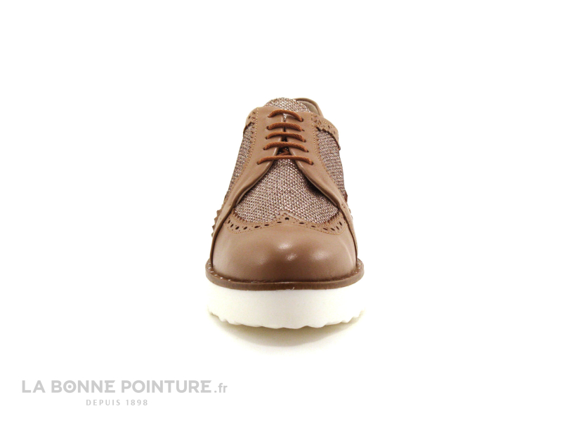 Cette chaussure Femme est en cuir marron clair, avec des empiècements argent métal, de fines perforations et des découpes dentelées…