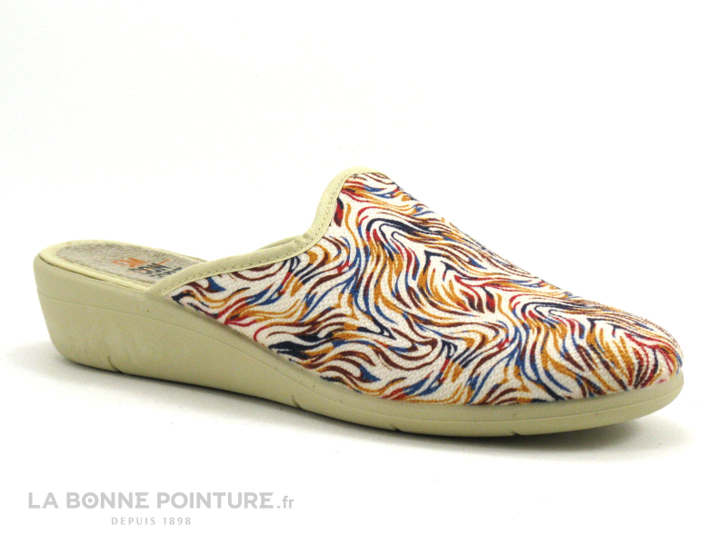 Souples et fantaisie avec leur imprimé multicolore sur fond beige, les pantoufles Femme à petit talon CM Confort 20056 !