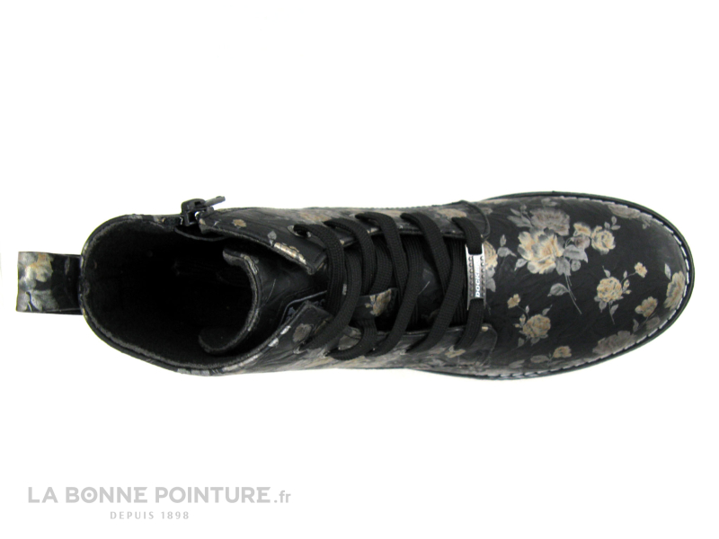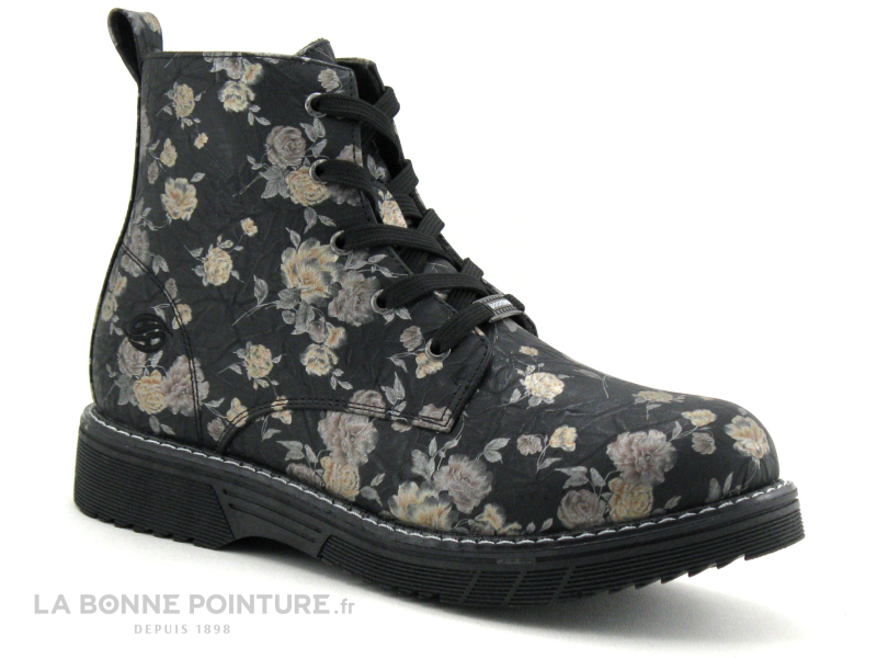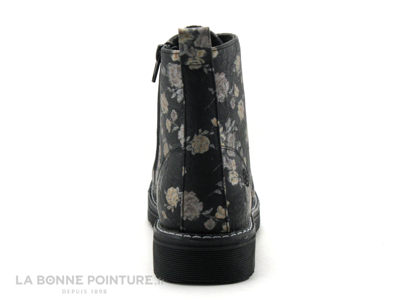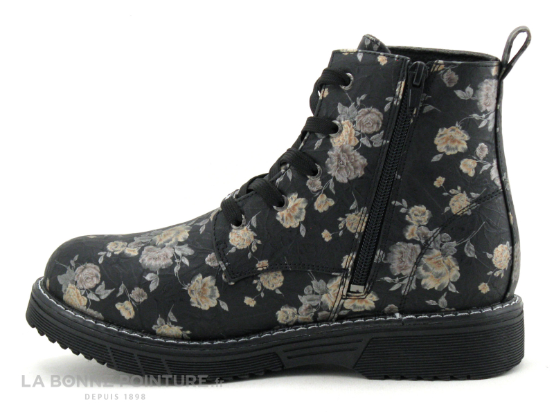 Cette bottine mode est en simili cuir noir, avec des fleurs aux tons de gris argent et de beige doré.