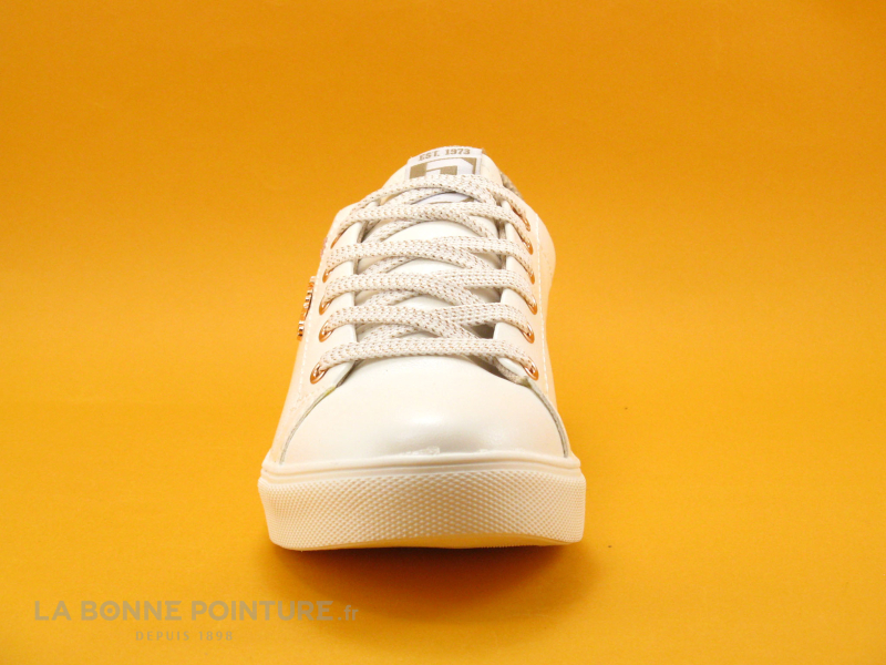 Cette basket blanche Femme est en simili cuir blanc, avec une partie rose reptile et rose métal à l’arrière.
