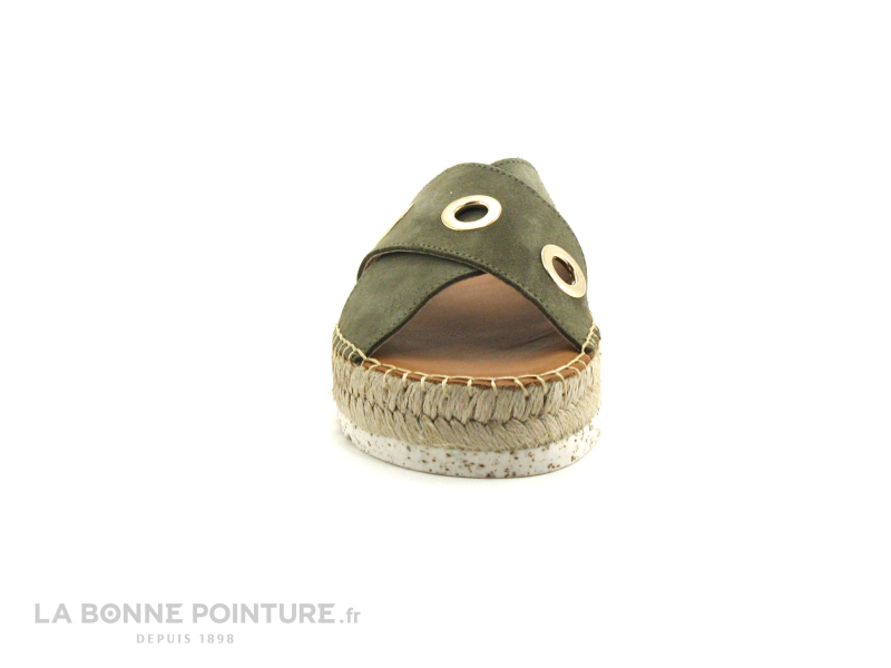 Cette mule Femme kaki est en cuir velouté, avec la bride du dessus ornée de 3 oeillets dorés.
