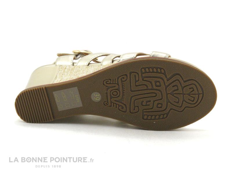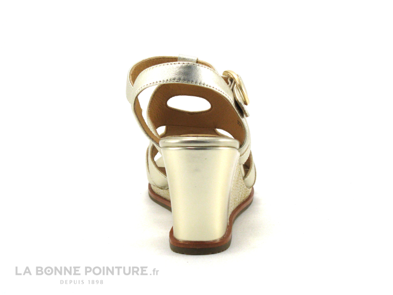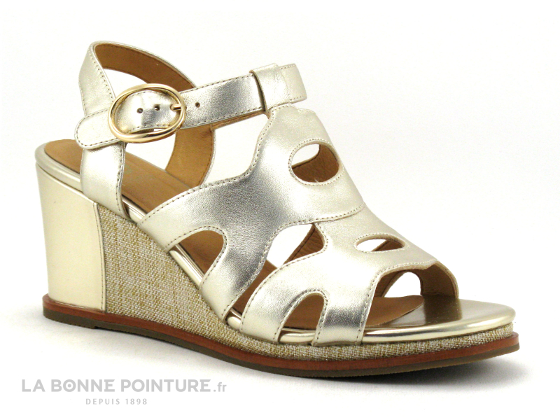 Ce nu-pieds Femme Fugitive Ireel à talon compensé est en cuir métallisé Or, avec des empiècements ajourés qui habillent le dessus du pied.