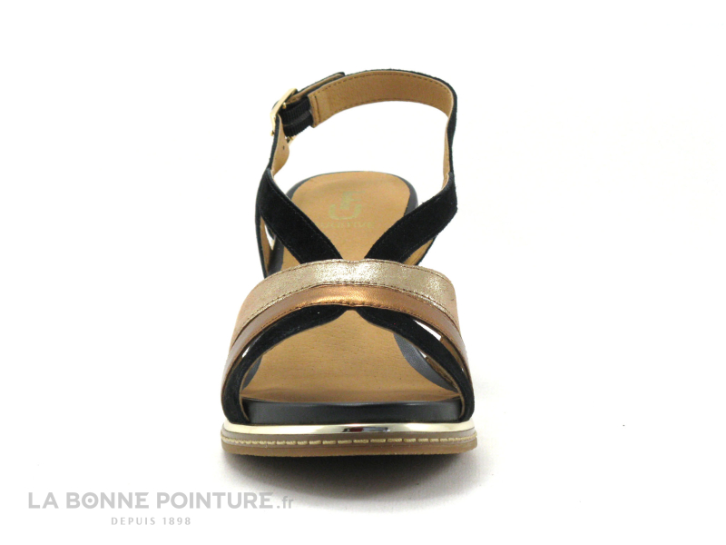Ce nu-pieds mode Femme Fugitive Izou est en cuir velouté noir, avec deux lanière métallisées rose et bronze orangé.