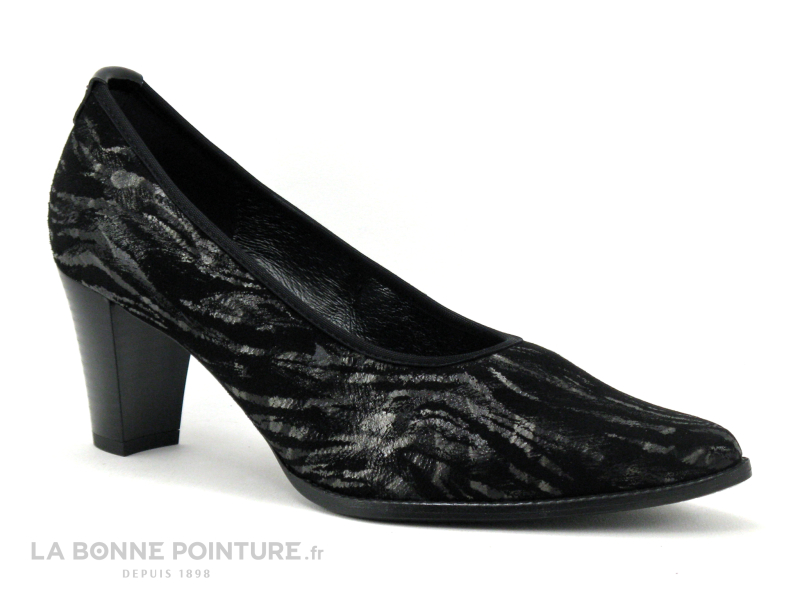 Ces escarpins adaptés aux pieds larges sont en cuir velouté noir zébrés argent, avec le bout pointu.