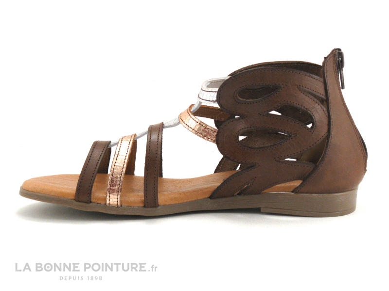 Ce nu-pieds Femme combine cuir marron et cuirs métallisés bronze et argent, pour une petite touche de brillance cet été…