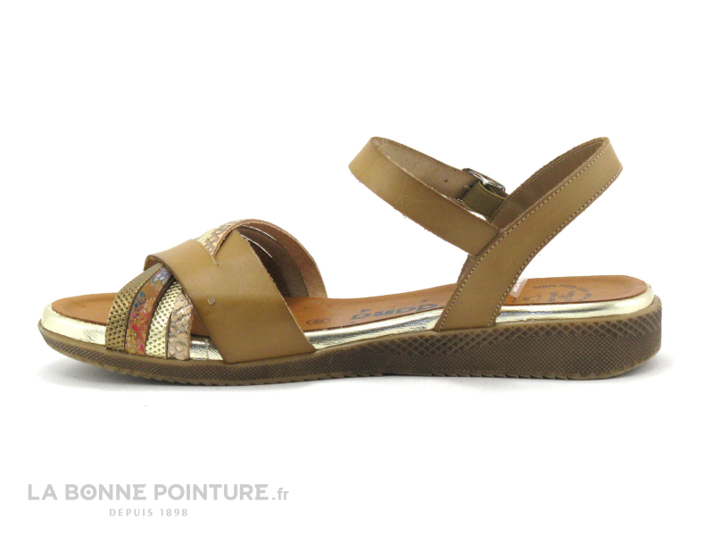 Ce nu-pieds mode Femme Jordana est principalement en cuir marron clair, avec de fines lanières métallisées et imprimées.