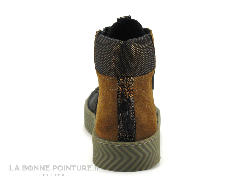 Cette chaussure montante originale Femme associe harmonieusement des empiècements noir métallisé, pailletés et marron camel.