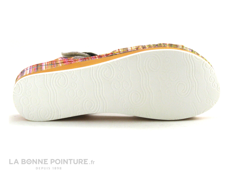 Cette chaussure ouverte Femme avec velcro est tout en cuir, avec des brides rayées multicolores et jaunes.
