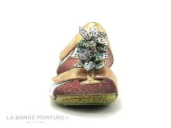 Le dessus de la chaussure Laura Vita est ornée d’anneaux métalliques bronze et d’une fleur avec perle verte au centre.