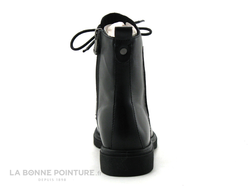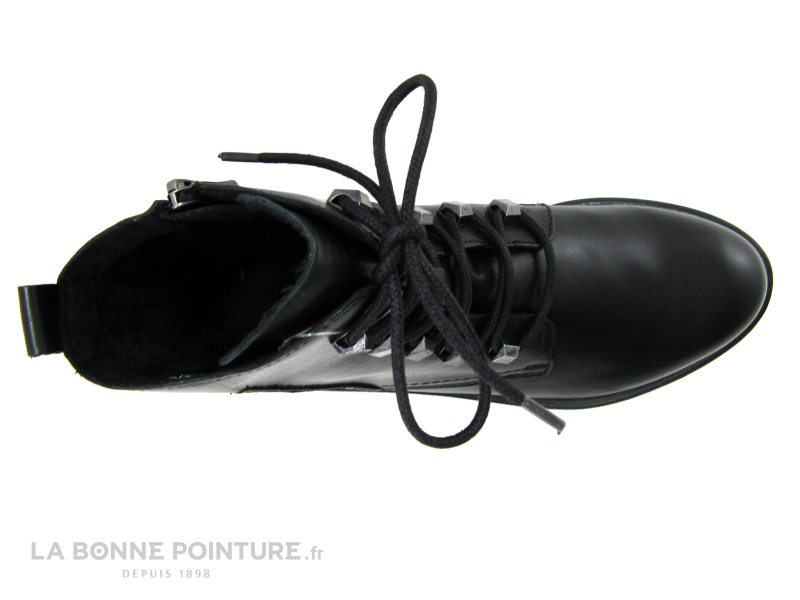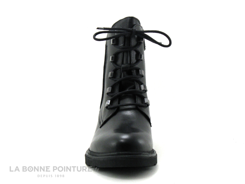 Cette bottine Femme à lacet est en cuir lisse noir, avec 5 oeillets de forme trapèze métallisés qui donnent de l’allure au modèle, traversés par un lacet rond noir.