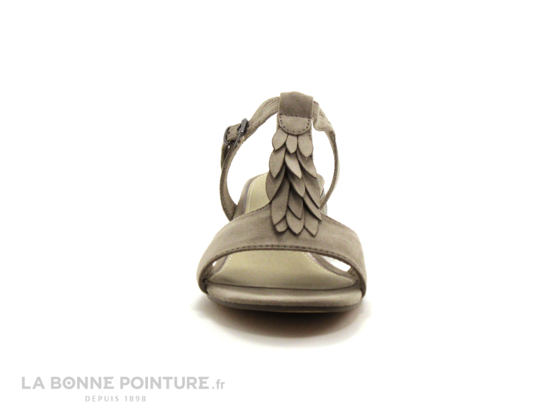 Cette sandale femme est beige velouté (taupe), avec une bride salomé ornée de pétales qui se superposent.