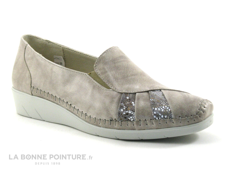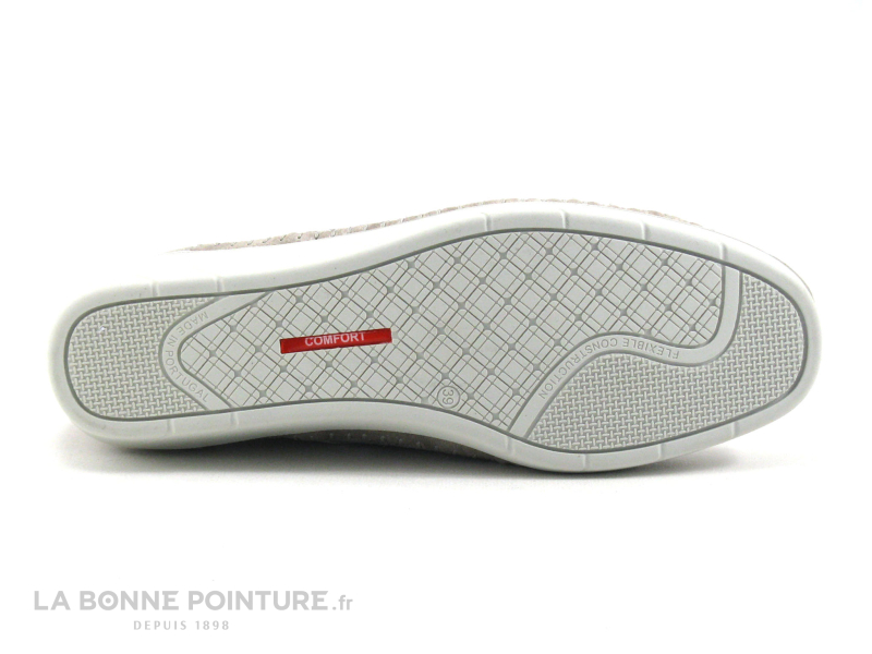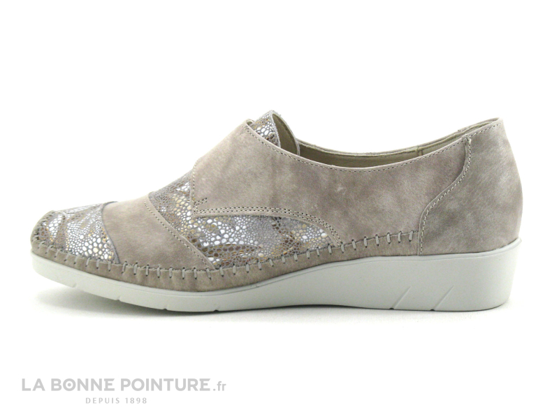 Cette chaussure Femme à semelle compensée est en cuir beige nuancé, avec des parties fantaisie aux tons de blanc, d’or et de gris argent.