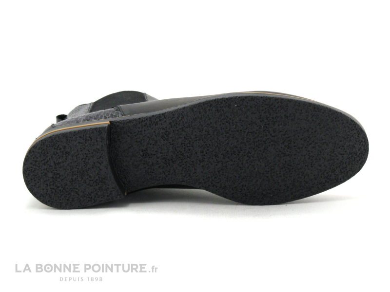 Cette chaussure montante Femme est en cuir lisse noir, avec une partie effet python noir et grise à l’arrière.