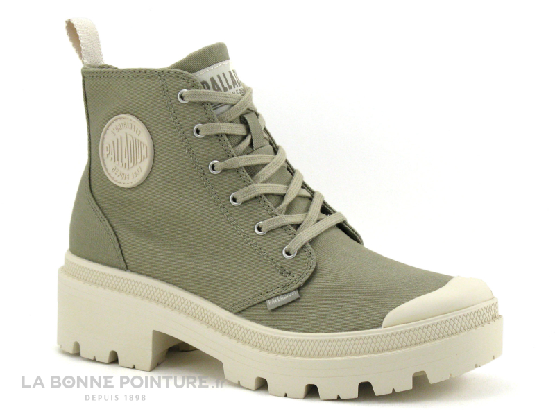Avec leur belle toile kaki, leur talon épais et leur semelle beige, on craque pour ces belles baskets montantes Femme Palladium Pallabase Twill dune !