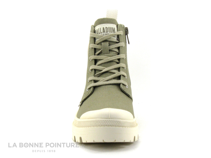 Cette basket montante Palladium Pallabase Women’s est en toile de qualité kaki (dune), avec un petit macaron beige marqué Palladium sur le côté externe de la chaussure.