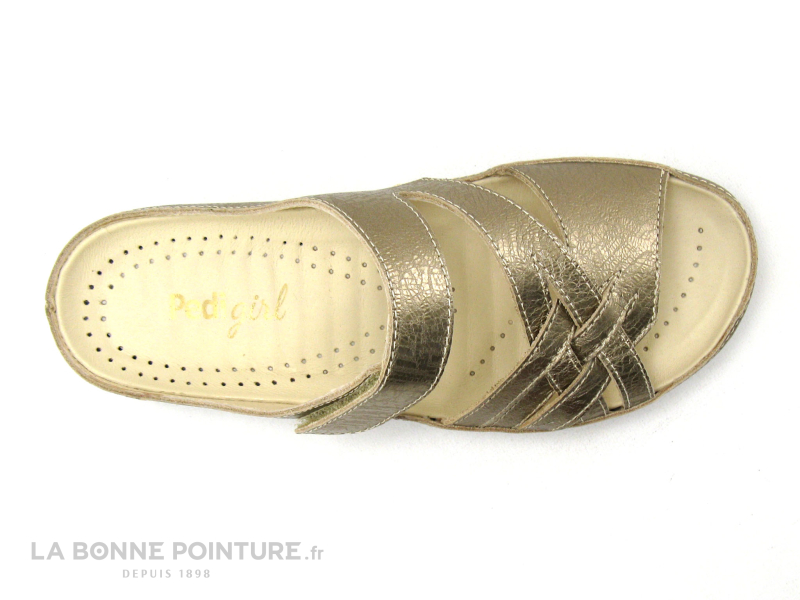 Cette mule confort femme est en cuir Or/bronze, avec des lanières savamment entrelacées sur le dessus.