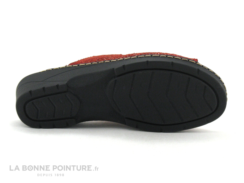 Cette mule confort Femme Pedi Girl mélange un cuir velouté rouge avec reflets métallisés et un cuir doré.