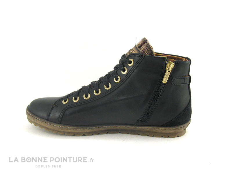 Un lacet en coton noir traverse 8 oeillets métalliques couleur Or, pour ajuster les chaussures Pikolinos Lagos à votre morphologie.