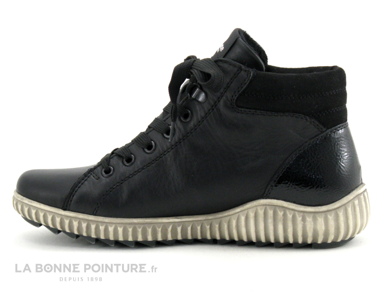 Cette chaussure montante Femme Remonte est toute noire, avec des parties vernies qui féminisent parfaitement la basket.