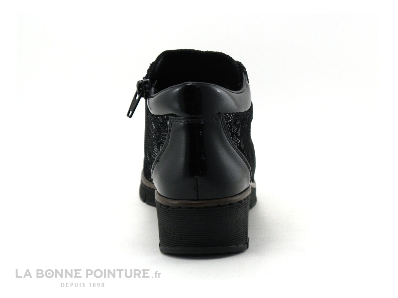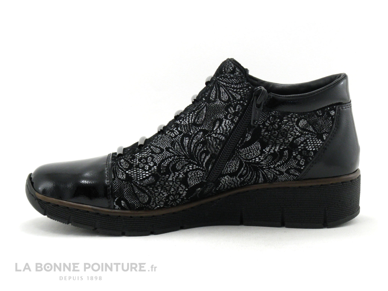 Cette chaussure montante Rieker Antistress 53778 est en cuir velouté noir et argent fleuri, avec la pointe et le contrefort vernis noirs.