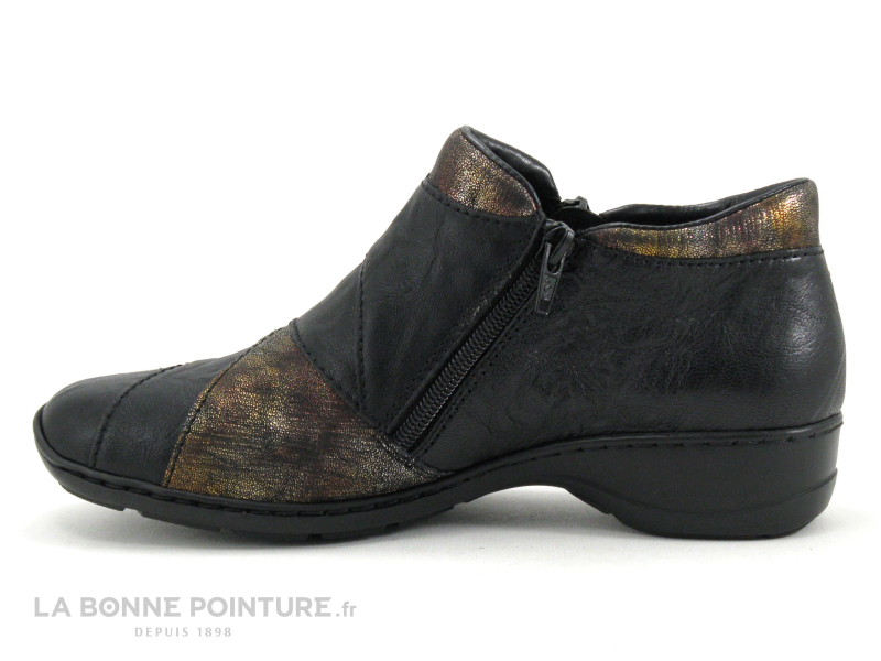 Cette chaussure montante Femme Rieker 58371-00 est noire aspect légèrement froissé, avec des parties métallisées bronze et or.