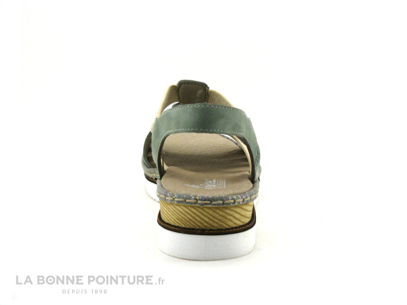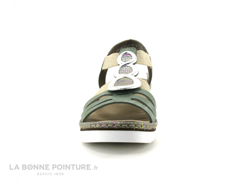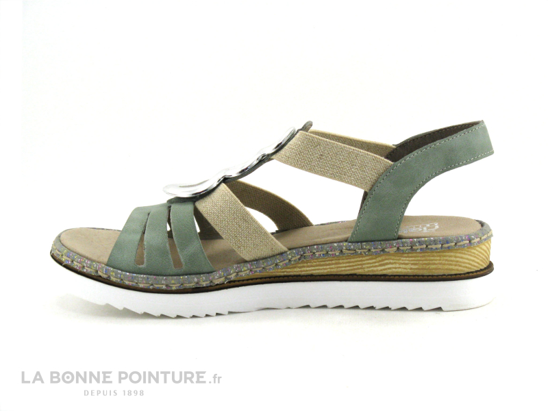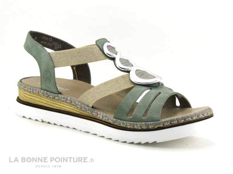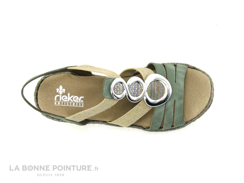 Ce nu-pieds Femme avec élastiques Rieker Antistress est vert avec des lanières beiges qui permettent d’enfiler facilement la sandale.