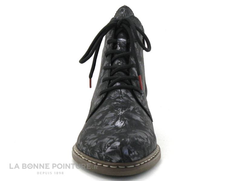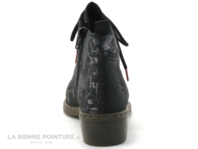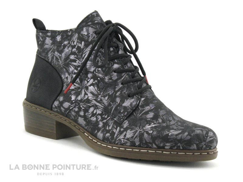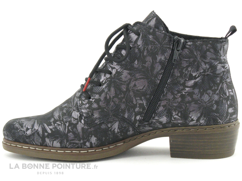 En effet, de manière discrète mais efficace un imprimé floral métallisé apparait sur le dessus de cette chaussure Rieker antistress Y0830-91 noire qui au toucher donne une impression peau de pêche.