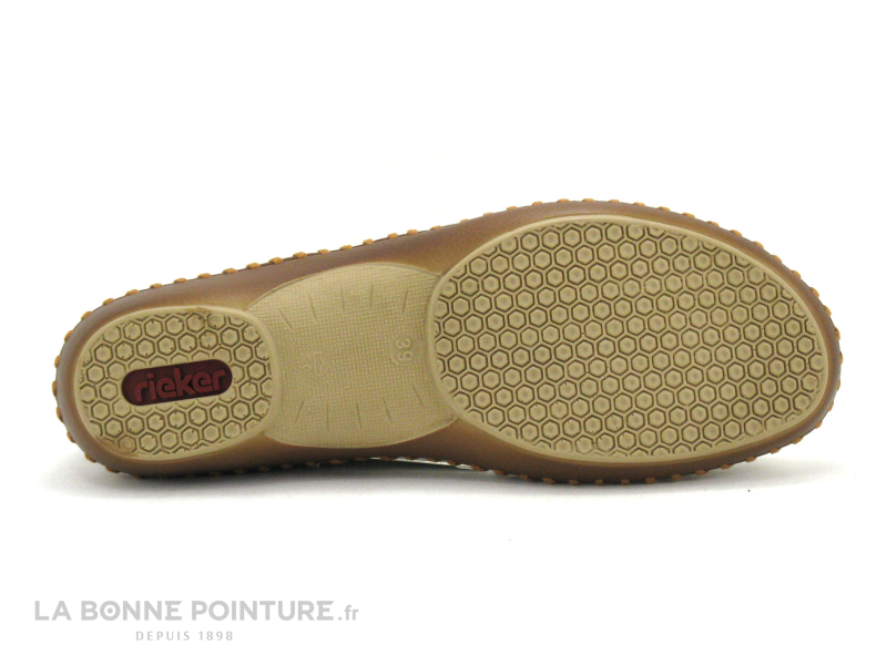 Les coutures apparentes marron camel qui relient la semelle et la tige caractérisent un peu plus cette belle sandale beige Rieker M1656-62.
