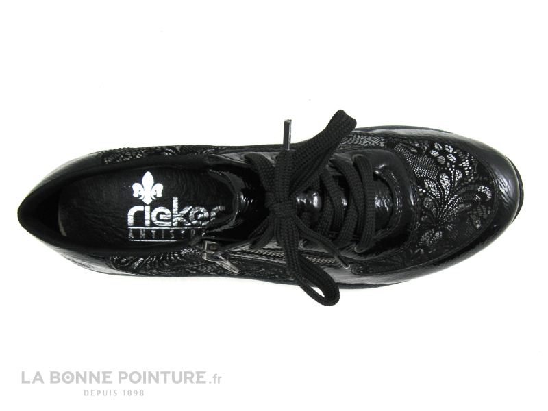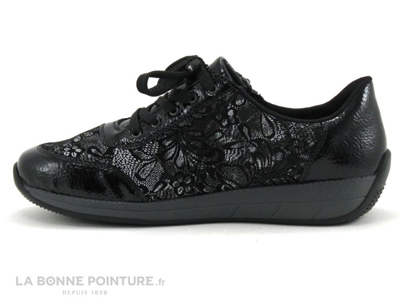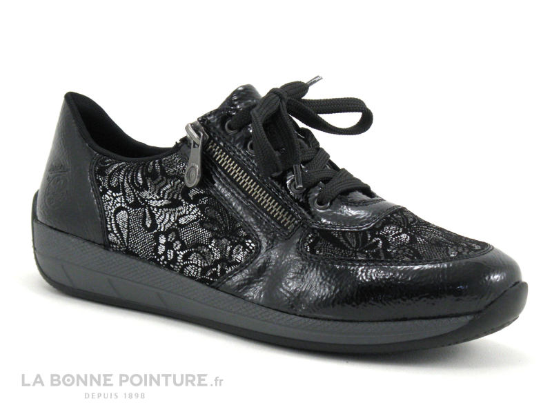 Cette chaussure basse Femme Rieker associe du noir verni et un imprimé floral argenté sur fond noir.