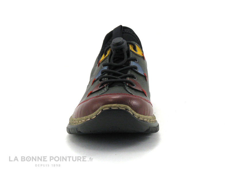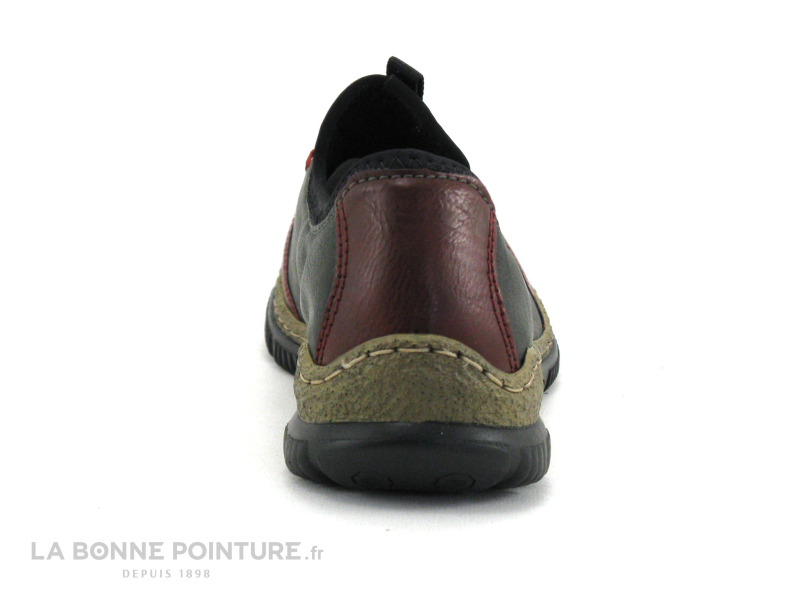 Cette chaussure multicolore Femme Rieker N3271-54 associe harmonieusement du kaki foncé, du noir et du bordeaux.