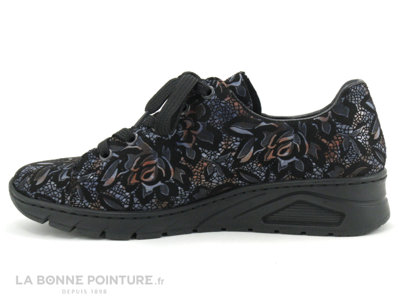 Cette chaussure basse Femme Rieker Antistress est noire imprimée de fioritures métallisées bleues et orange.