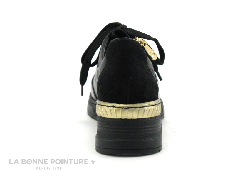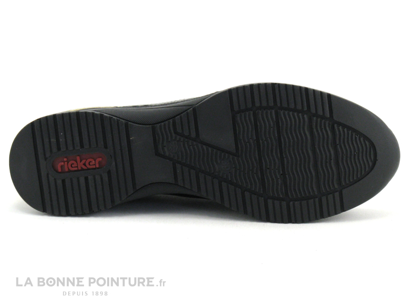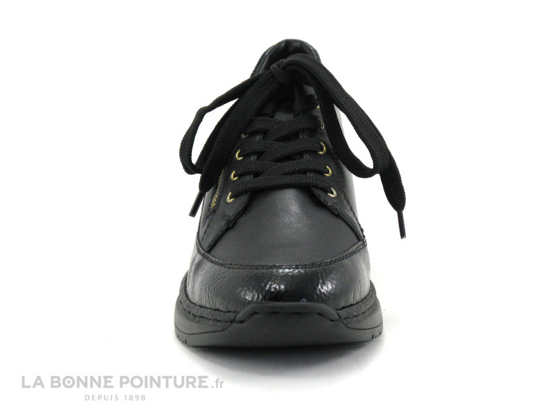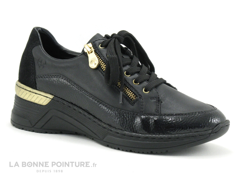 Cette belle basket Femme noire Rieker Antistress associe des parties mates, veloutées et vernies avec un peu de doré sur la semelle.