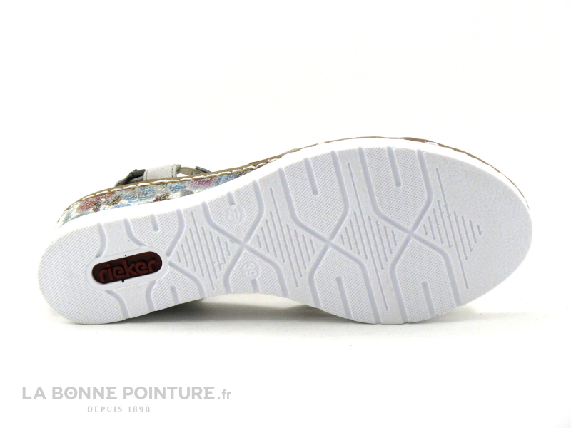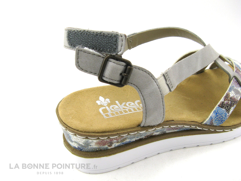 La bride à l’arrière de la chaussure Femme Rieker est équipée d’un velcro, permettant de fermer facilement la sandale (la petite boucle métallique est factice et décorative).