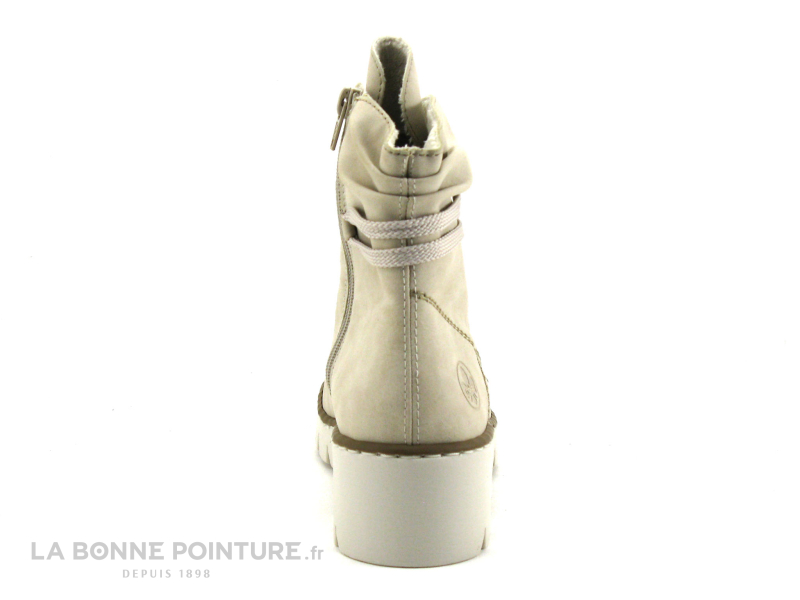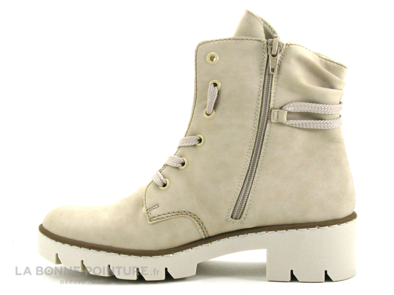 Cette bottine ranger Femme Rieker est en simili cuir beige clair aspect peau de pêche, à l’aspect légèrement nervuré.