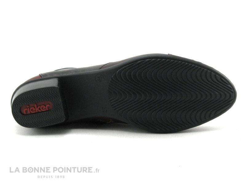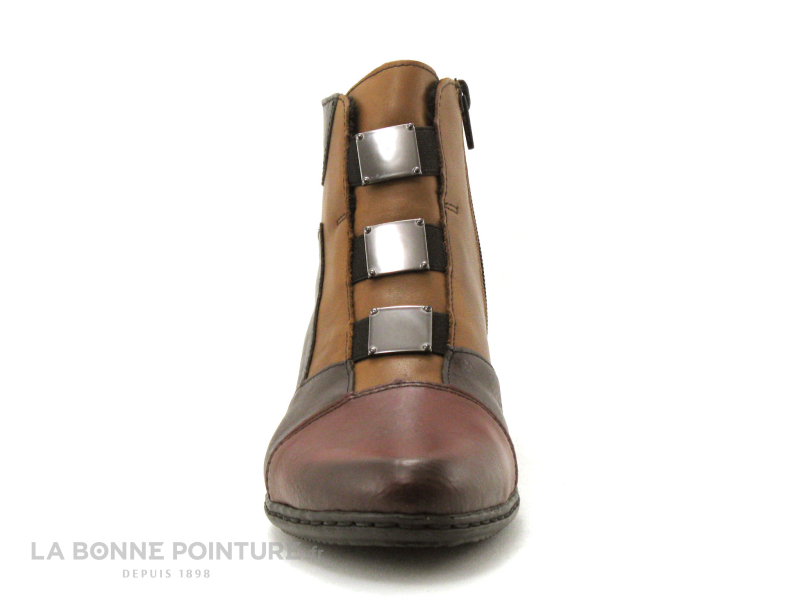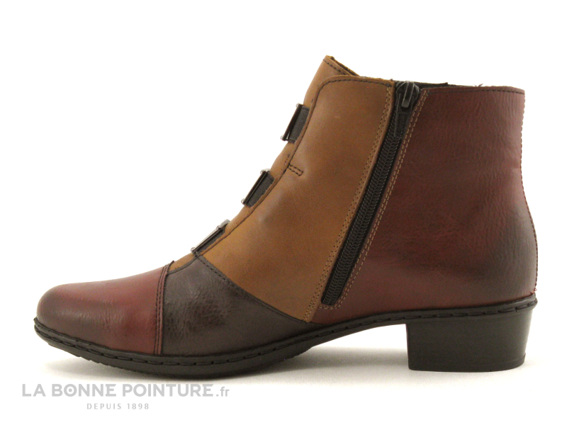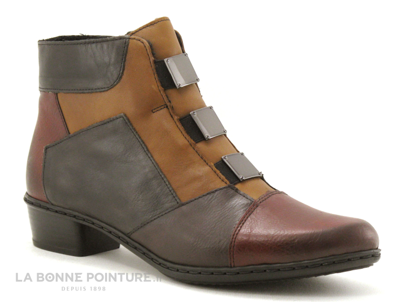 Cette bottine souple Rieker Femme combine du bordeaux, du camel, du marron foncé et du noir grisé, des tons mode et harmonieux.