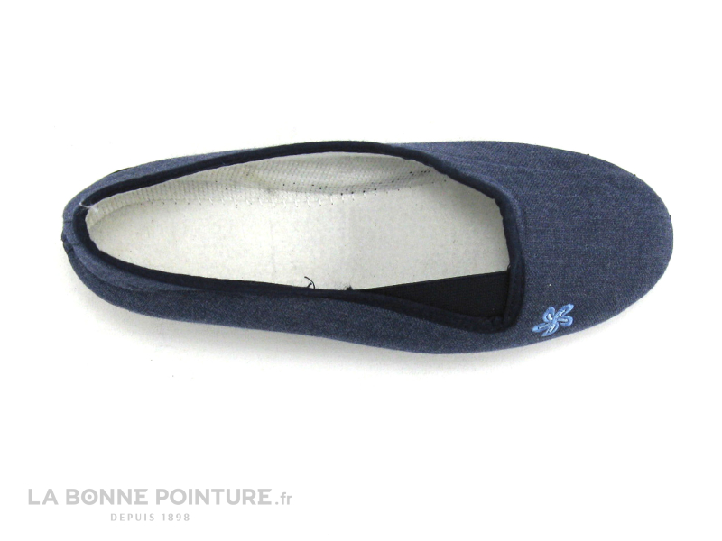 Cette pantoufle Femme pas chère est en toile bleue, ornée d’une jolie fleur bleu clair.