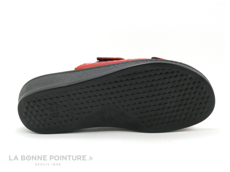 Cette mule réglable Femme Sanital 1475 est en cuir enduit rouge verni aspect croco, avec doublure et semelle interne en cuir.