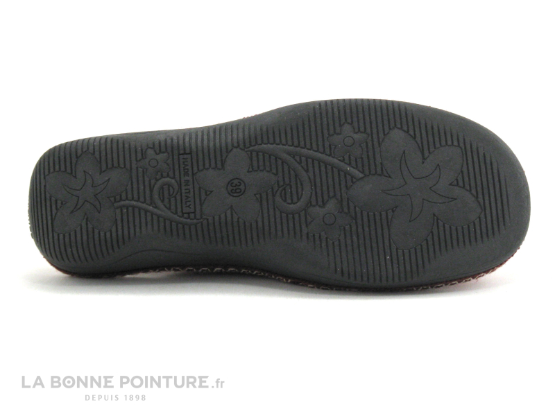 Cette pantoufle Femme est en velours bordeaux, avec un liseré fantaisie sur le pourtour.