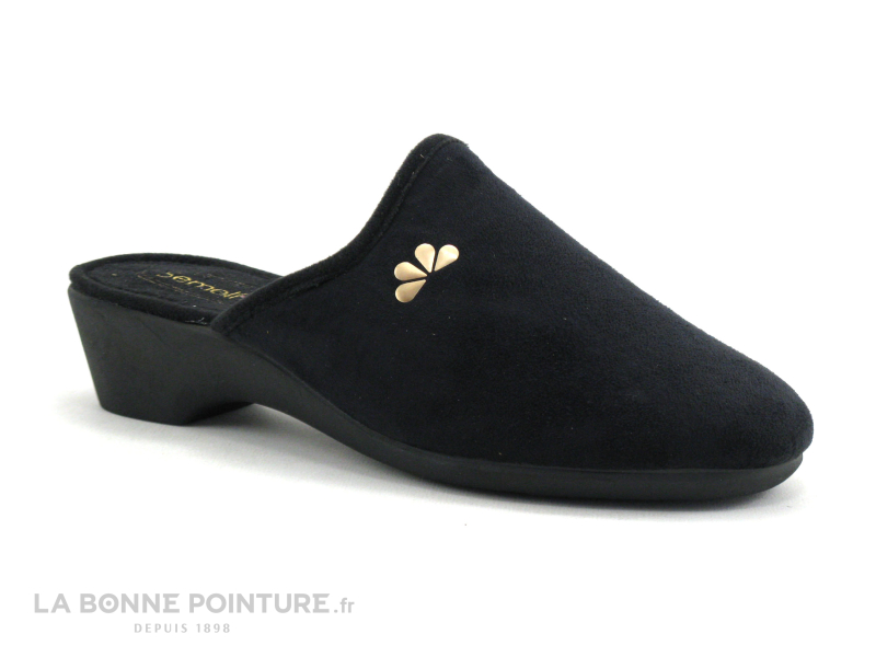 Cette pantoufle Femme à petit talon est en velours noir, avec des pétales dorés sur le dessus.