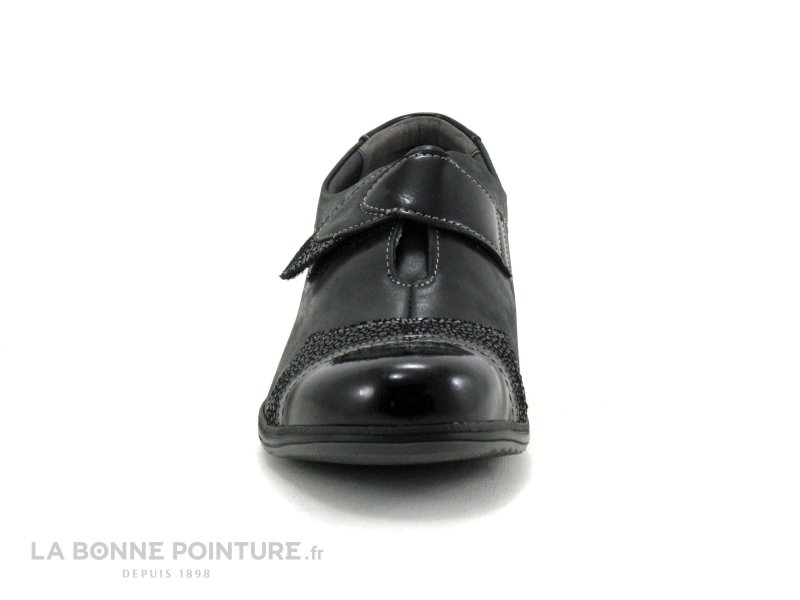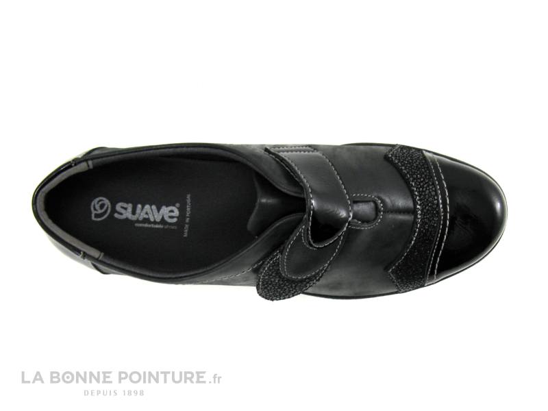 Voici de belles chaussures à scratch Femme Suave Dallas 7550T en cuir velouté noir, avec des parties vernies.