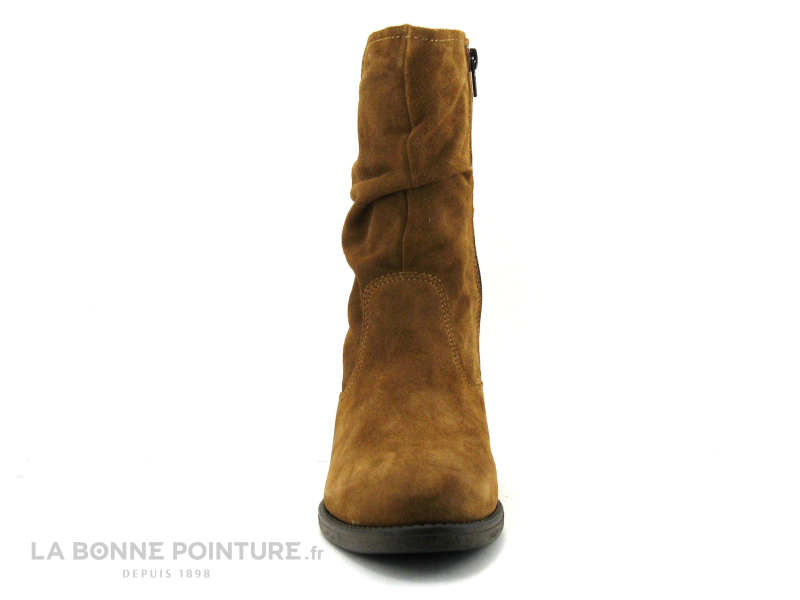 Cette botte mi-hauteur Tamaris 25480 est en cuir velours marron cognac, avec la tige légèrement froncée et une petite fente sur le côté externe.