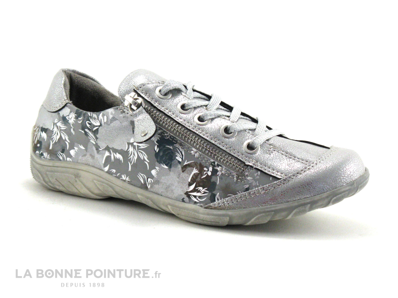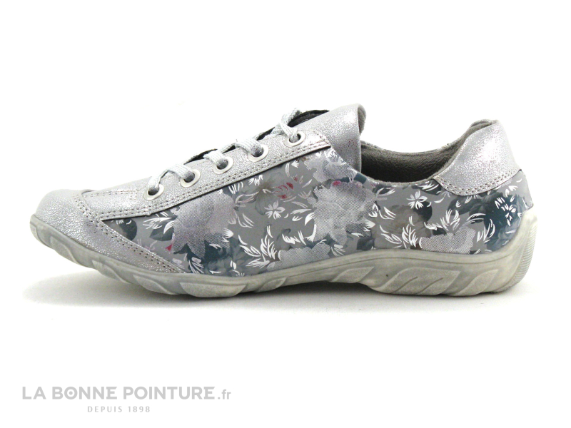 Ces tennis mode Femme combinent des empiècements argent et fleuris, aux tons de gris et de bleu.